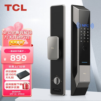 TCL-(V9)同样是NFC感应即开智能锁,采用半导体指纹识别,秒速开锁一握即开;NFC开锁兼容手机,手环,手表以及钥匙,支持wifi智能控制,C级高安全性锁芯,以及电子门锁功能,可以本地加远程及时提醒,入手价格比较便宜,综合性价比还是比较高。